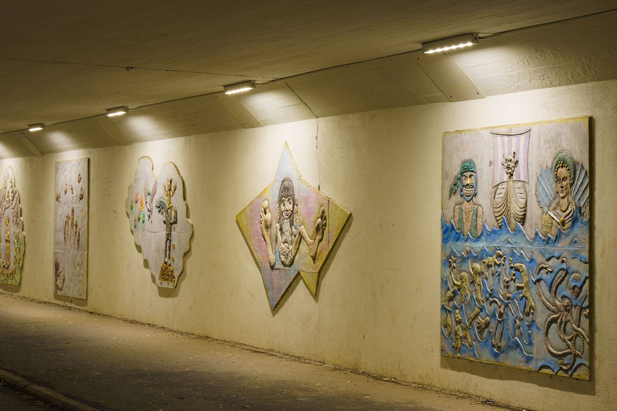 I Årby tunneln sitter det konstverk på väggarna som man valt att belysa. Det skapar en behaglig och bländfri belysning genom tunneln där konstverken är i fokus. Här används armaturen Ecoline.