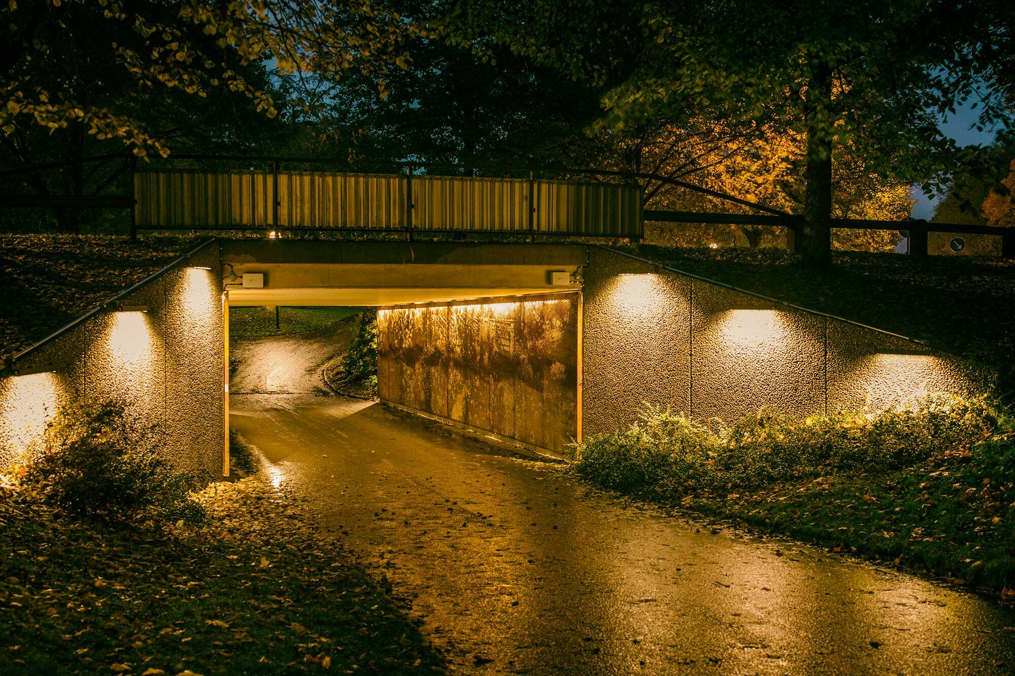 Det är viktigt att även belysa området innan och efter tunneln för att det inte ska bli en för stor kontrast för ögat. Förslagsvis kan man belysa väggen utanför tunneln med en wall washer armatur tex Ecoline.